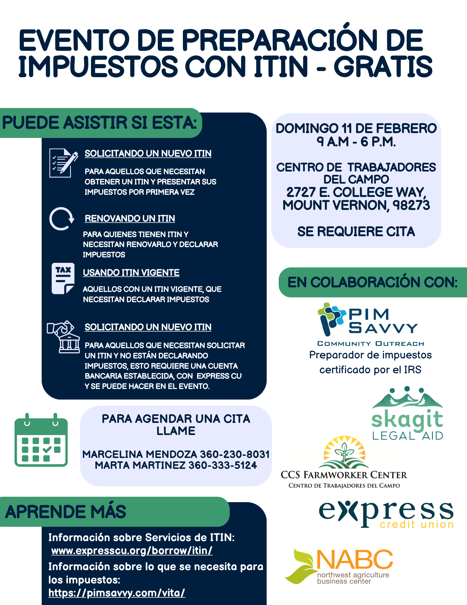 EVENTO DE PREPARACIÓN DE IMPUESTOS CON ITIN - GRATIS Sunday, February 11, 2024 9:00 AM 5:00 PM CCS Farmworker Center 2727 East College Way Mount Vernon, WA, 98273 United States (map) Google Calendar ICS Para agendar una cita llame Marcelina Mendoza al 360-230-8031. Ella revisará su situación y se asegurará de que venga preparado con la documentación adecuada.